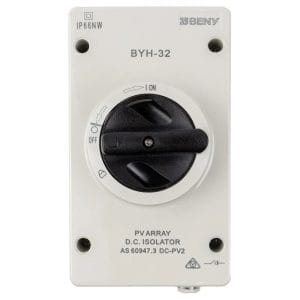Professional-grade BENY BYH-32 DC isolator switch with IP66 weather protection. Available in 2-pole and 4-pole configurations, rated for 1000V DC 32A. Perfect for outdoor solar PV installations requiring reliable DC
