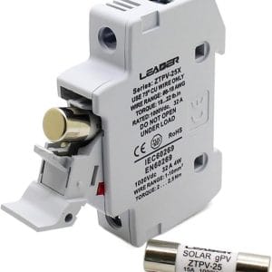 Professional 20A DC fuse with holder engineered for solar PV systems. Complete protection package includes high-performance fuse and weatherproof holder. Perfect for reliable solar circuit protection and enhanced system safety.