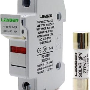 Industrial-grade 32A 1000V DC fuse with holder designed for high-power solar PV systems. Complete protection package includes high-performance fuse and robust holder. Essential for heavy-duty solar circuit protection and system